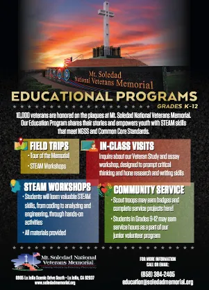At the heart of Mt. Soledad stands more than just a memorial — it’s a living tribute to the courage, sacrifice, and resilience of our nation’s veterans. Through our educational programs, we aim to bring history to life for students of all ages, inspiring a deeper appreciation for those who have served and protected our freedoms.